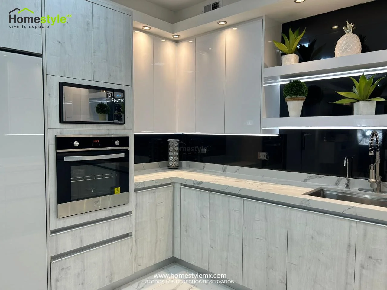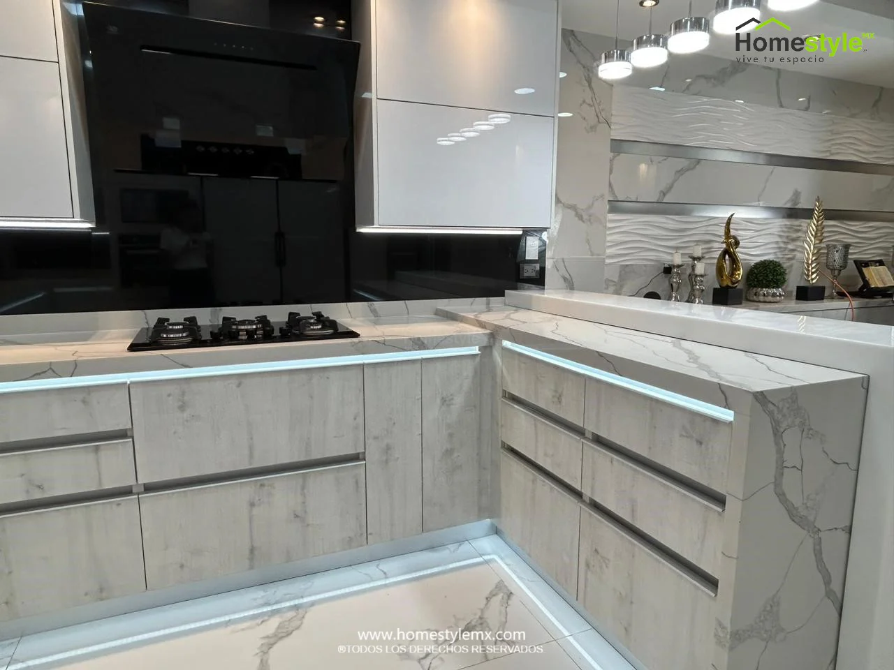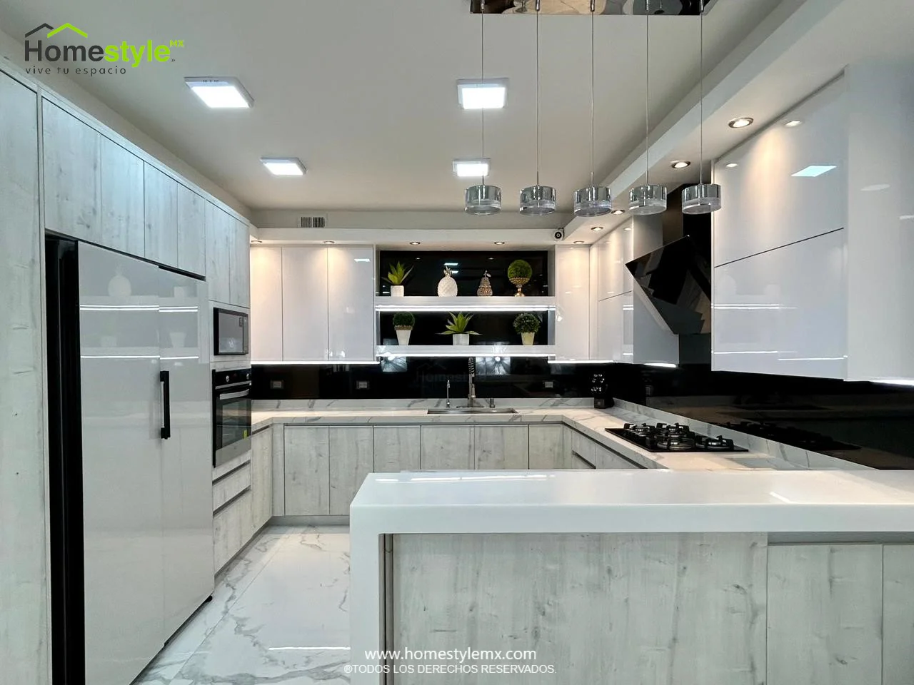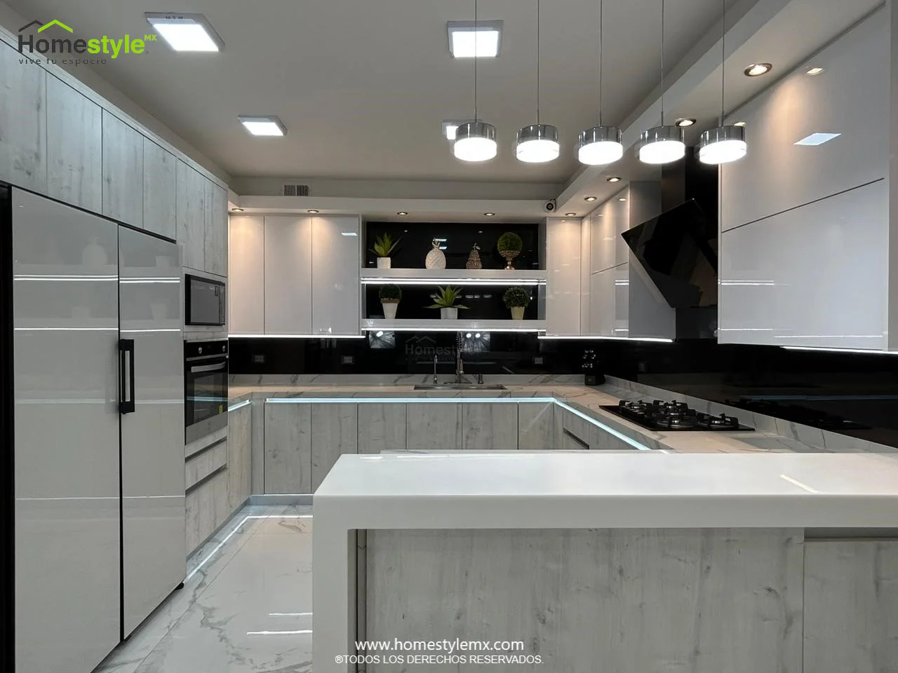 | Materiales | Melamina Vesto Alaska, MDF Alto Brillo Blanco y MDF Alto Brillo Negro. Cubierta: Cuarzo Calcutta Marble y Superficie Solida Wilsonart Super White. |