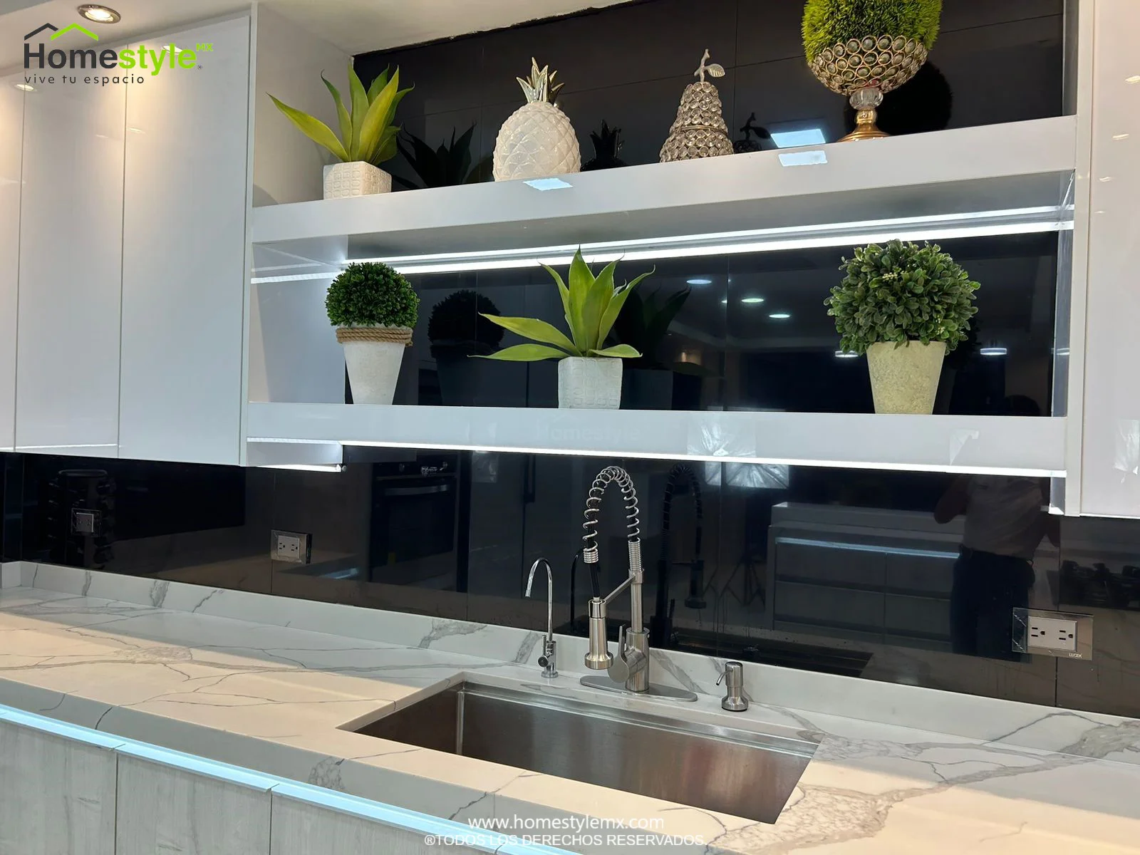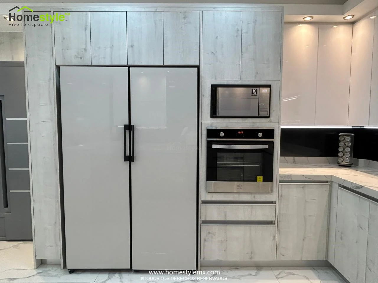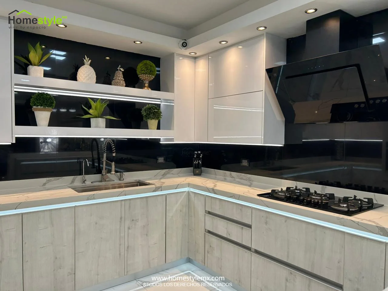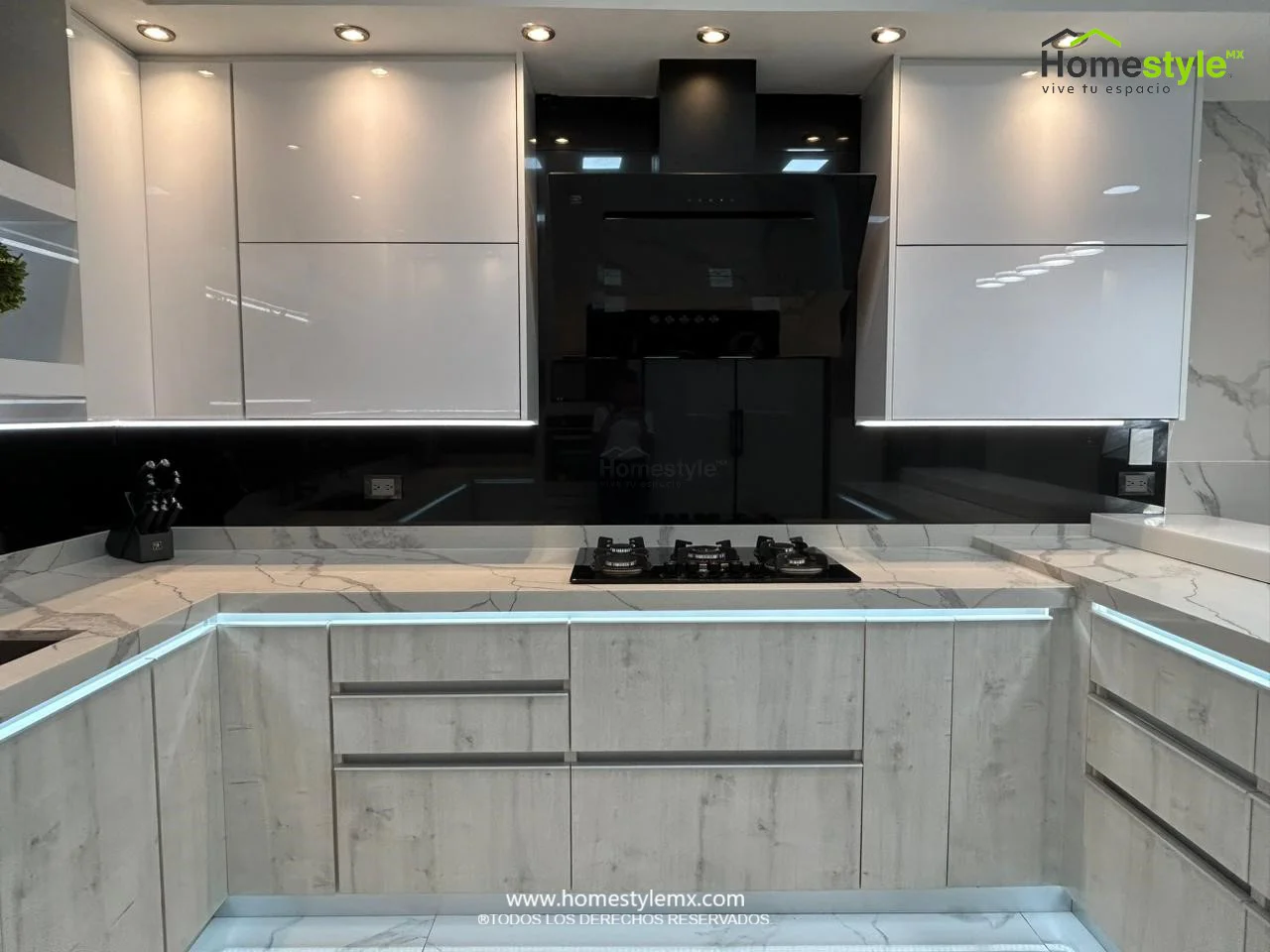 | Materiales | Melamina Vesto Alaska, MDF Alto Brillo Blanco y MDF Alto Brillo Negro. Cubierta: Cuarzo Calcutta Marble y Superficie Solida Wilsonart Super White. |