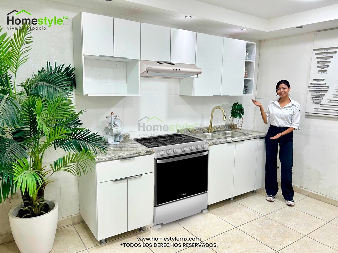 Cocina en forma lineal diseñada en Melamina Blanca para gabinetes con una cubierta de Formaica Granito Amárelo.
