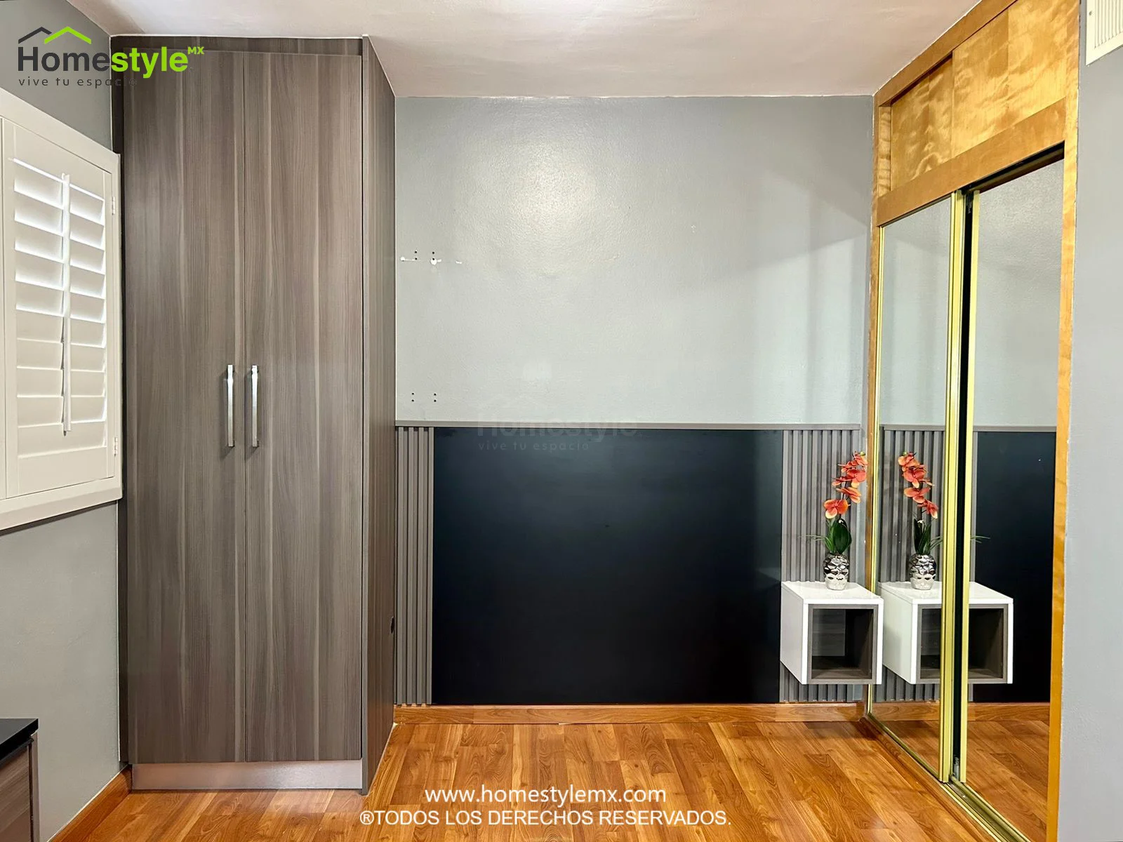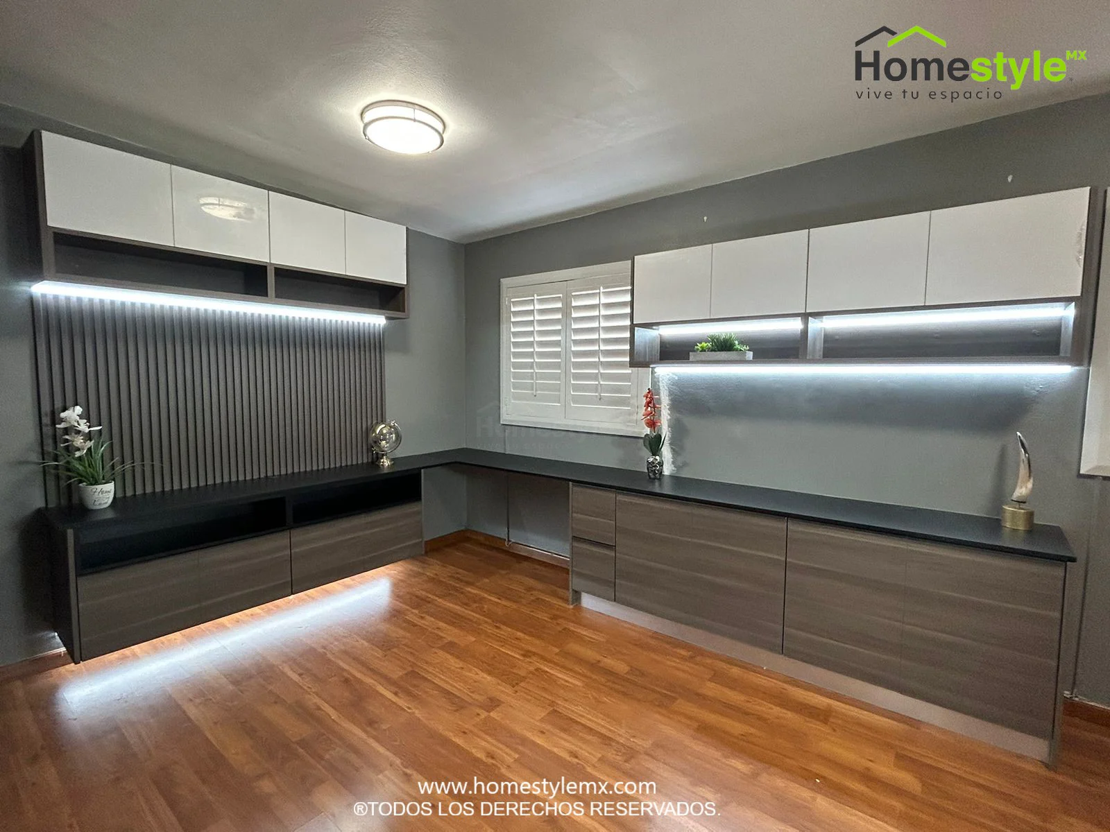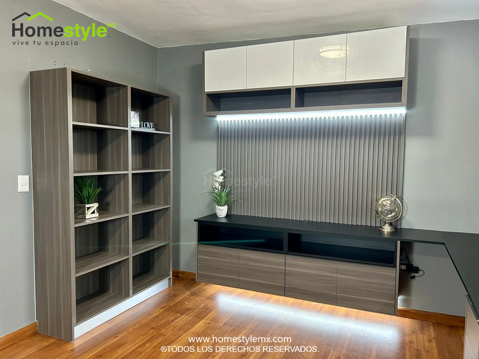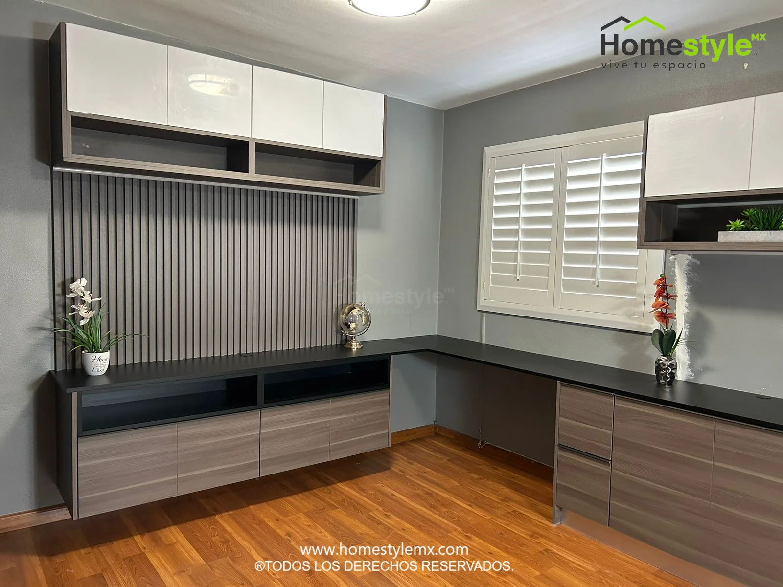 Remodelación de habitación, incluye mueble de televisión, espacios de almacenamiento, escritorio y cabecera. Diseñada en Melamina Vesto Linosa Ceniza y MDF Alto Brillo Blanco. Con una cubierta de Melamina Negra.