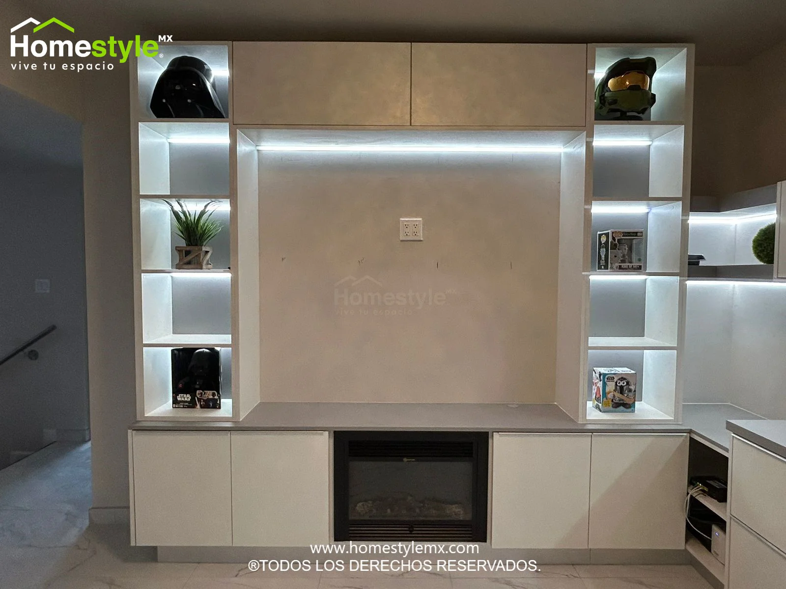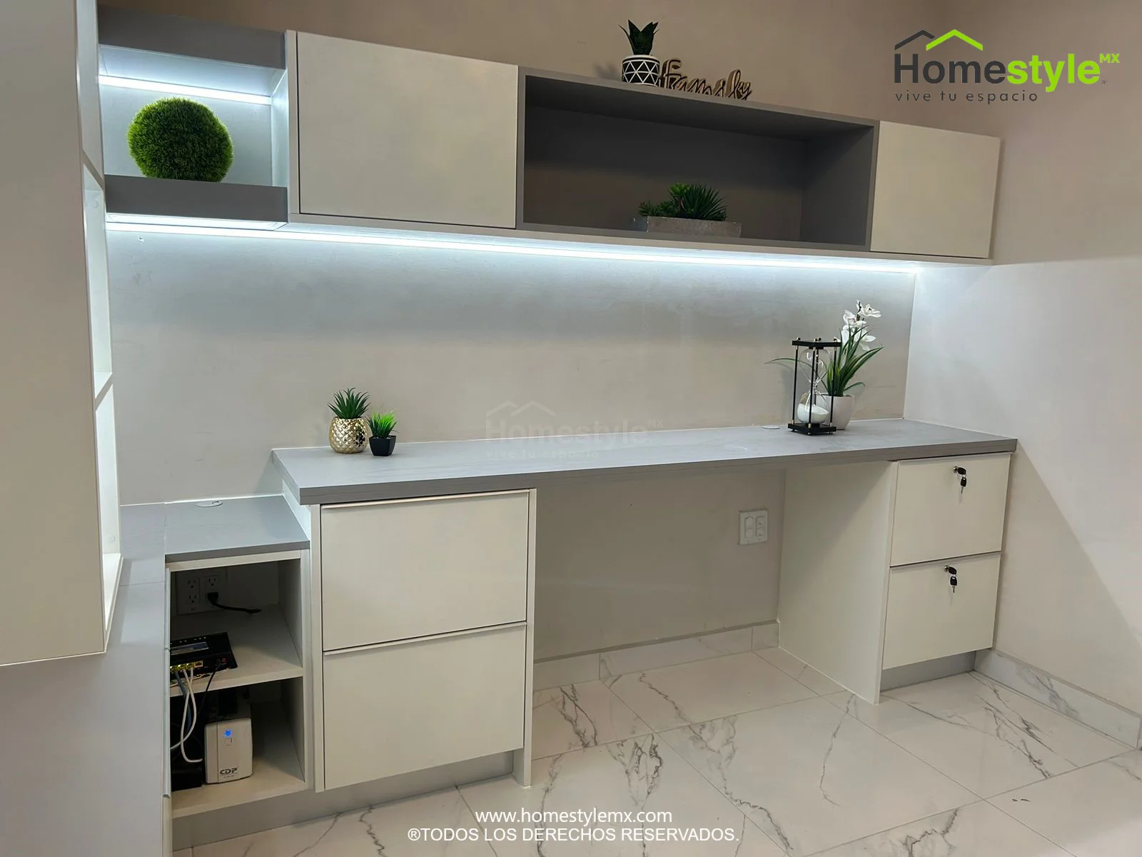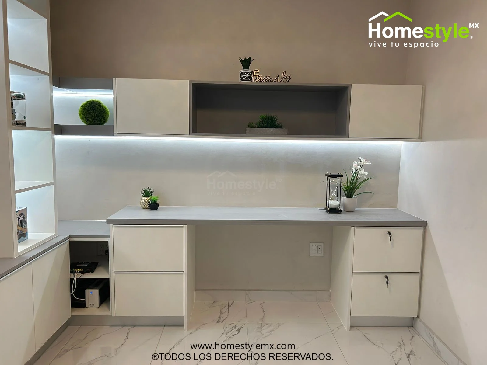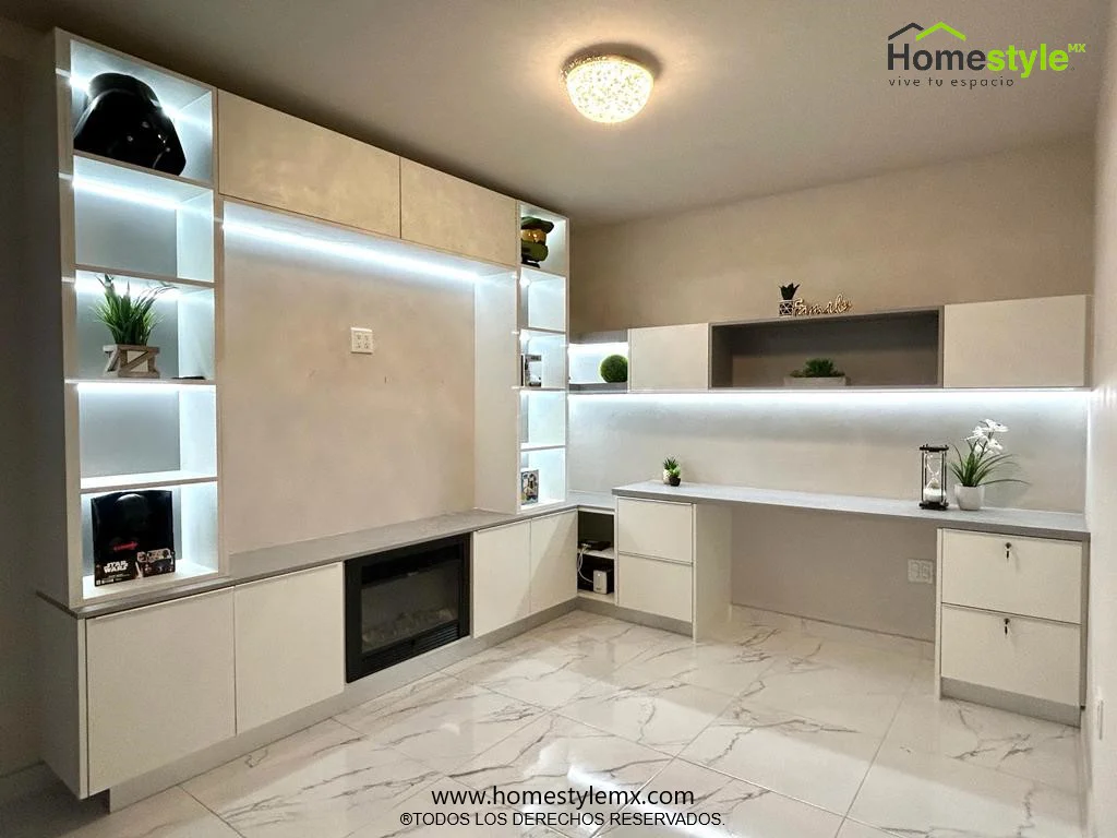 Iluminación integrada en gabinetes y combinación de área de TV con oficina.